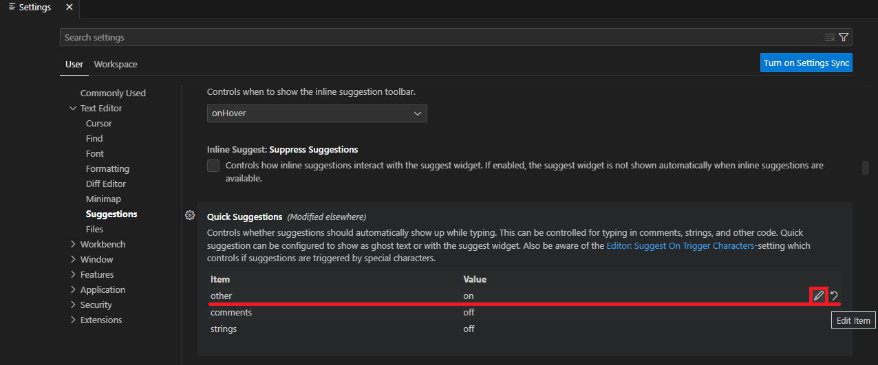 Ctrl + , 을 눌러서 설정창을 열고 User > Text Editor > Suggestions > Quick Suggestions 에서